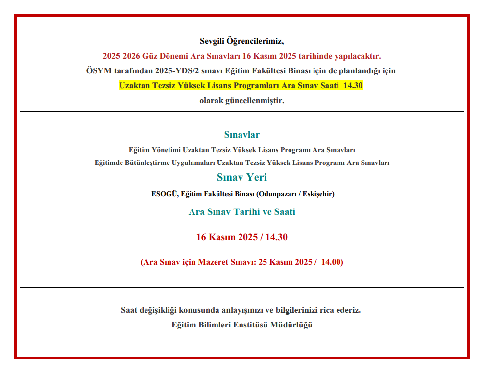 (SAAT DEĞİŞİKLİĞİ) 16 Kasım 2025 Uzaktan Tezsiz Yüksek Lisans Ara Sınavları Hakkında